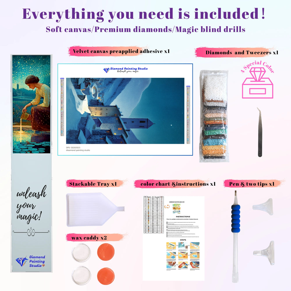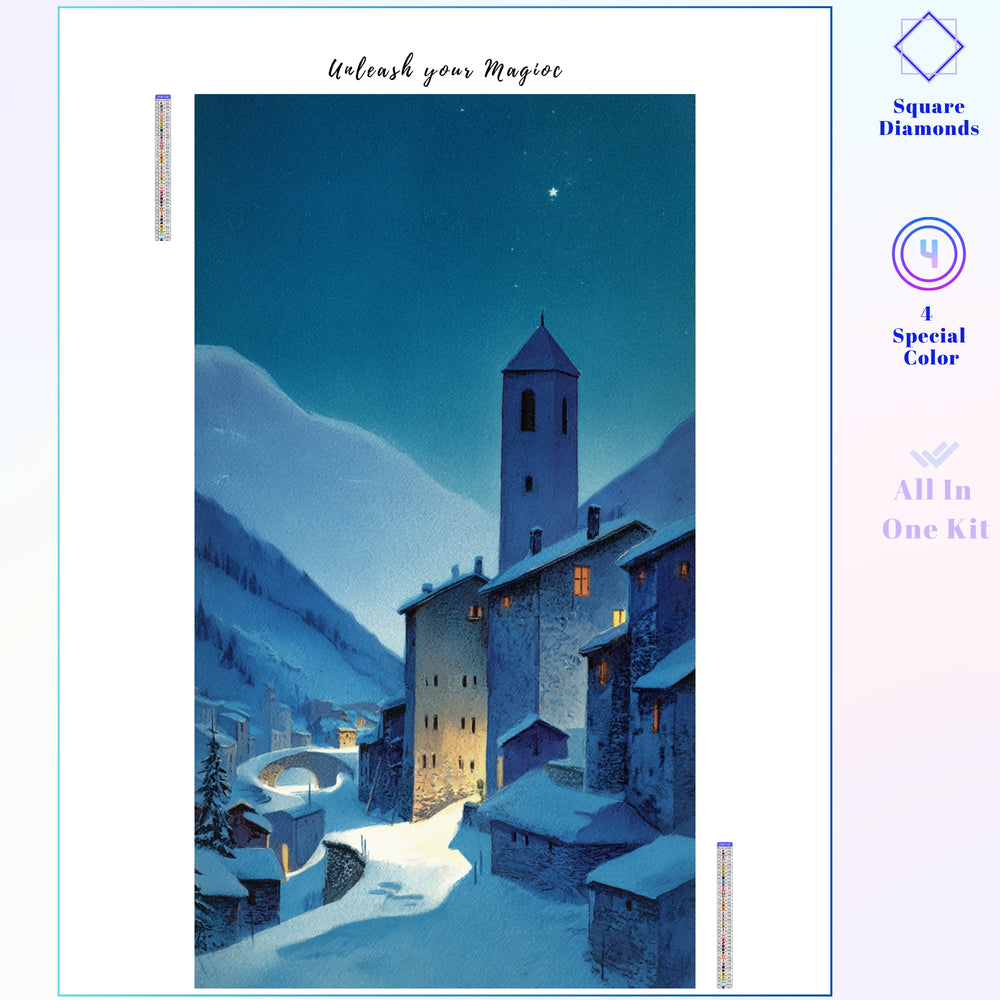 This design is a peaceful vision of a snow-covered sanctuary. A warm glow emanates from the windows of a quiet village nestled in the mountains, all beneath a vast, dark sky holding a single guiding star. It captures the comforting magic of winter and the promise of home. This immersive project lets you create a masterpiece that embodies serenity and enduring hope.