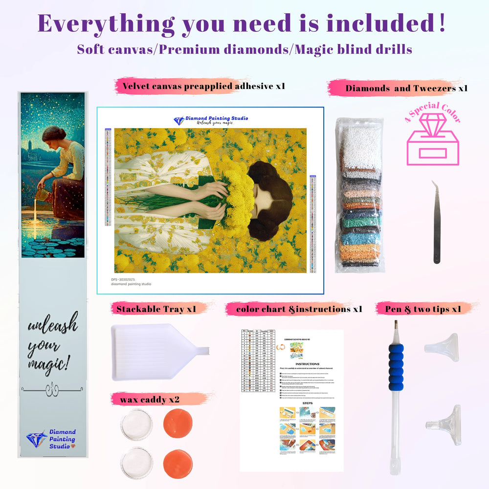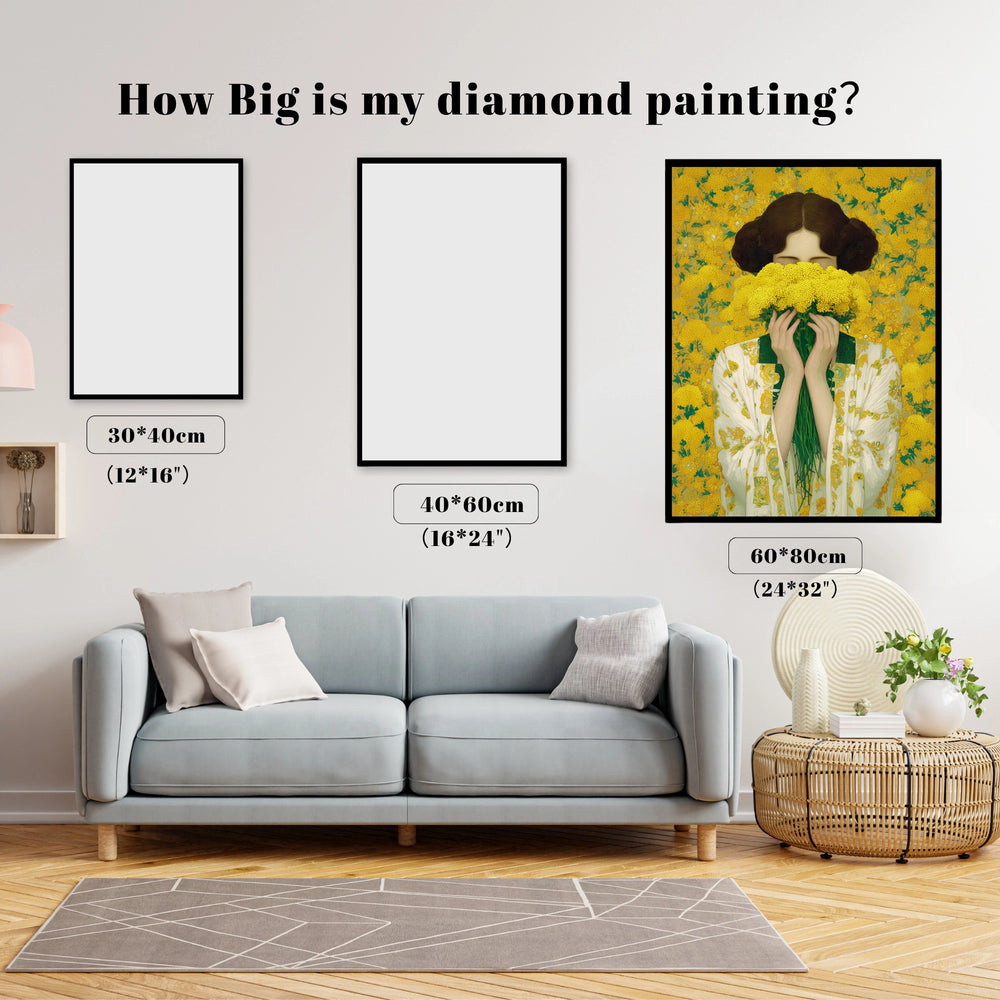 This design is an exquisite study in sensory pleasure and introspection. The figure holds a vibrant bouquet of yellow flowers, concealing her face and evoking a moment of total immersion in scent and self. The dense, textured yellow background creates a field of pure joy. This profound project lets you create a beautiful masterpiece that celebrates quiet contemplation and the simple magic of nature.